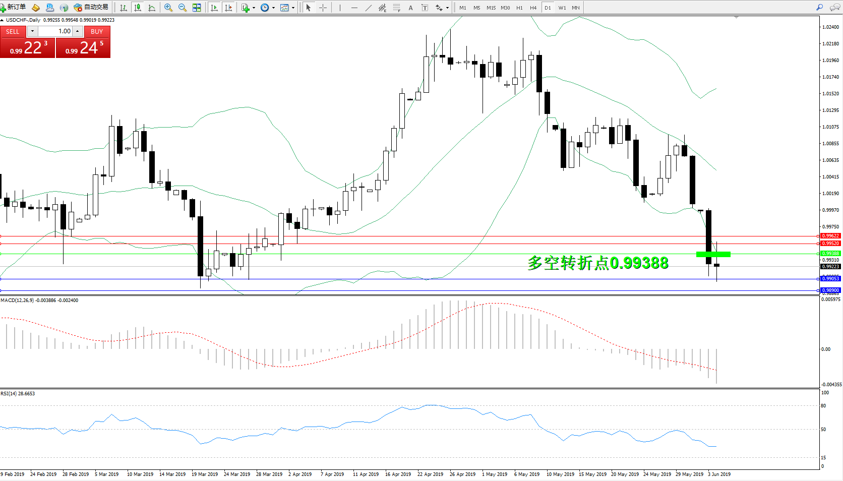 交易策略:0.99388下方看跌,目标0.99053、0.98900