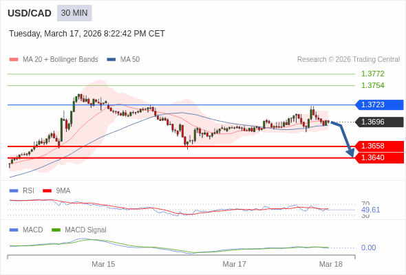 美元/加元 当日内 : 逐渐下跌,当 1.3723 阻碍上行,则 1.3640 为目标位。
