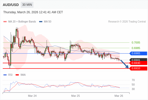 在 0.6965 之下,看跌,目标价位为 0.6930 ,然后为 0.6910 。