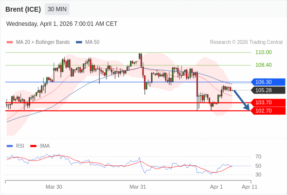 布伦特原油 (ICE) (M6) 当日内: 短期关键阻力位在106.30。