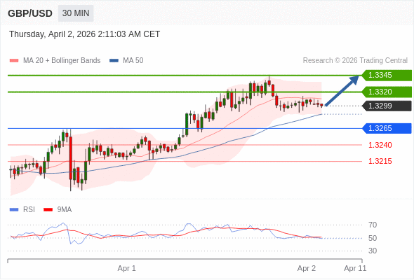 在 1.3265 之上,看涨,目标价位为 1.3320 ,然后为 1.3345 。