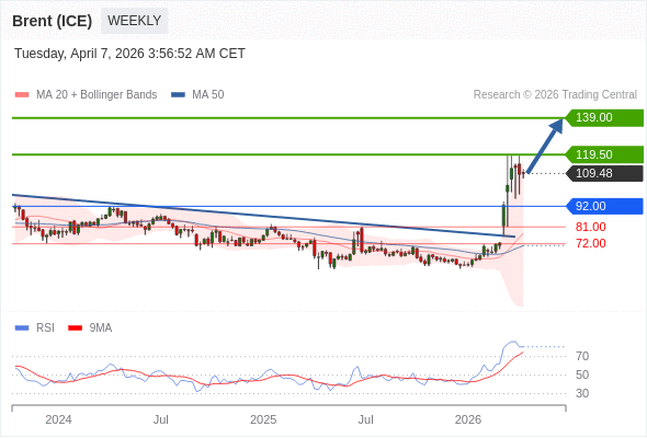 布伦特原油 (ICE) (M6) 中期: 期待119.50。