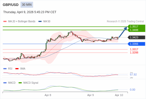 英镑/美元 当日内 : 看涨,当 1.3366 为支撑位。