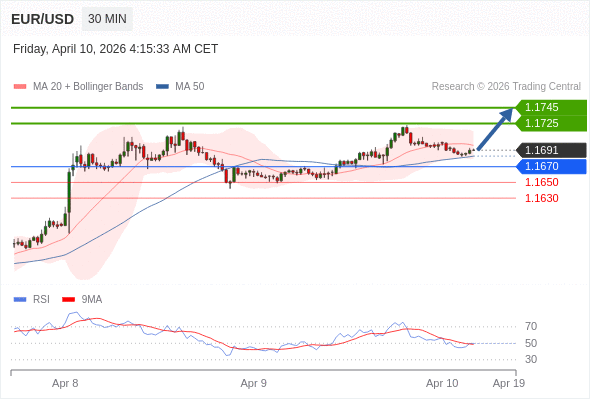 在 1.1670 之上,看涨,目标价位为 1.1725 ,然后为 1.1745 。