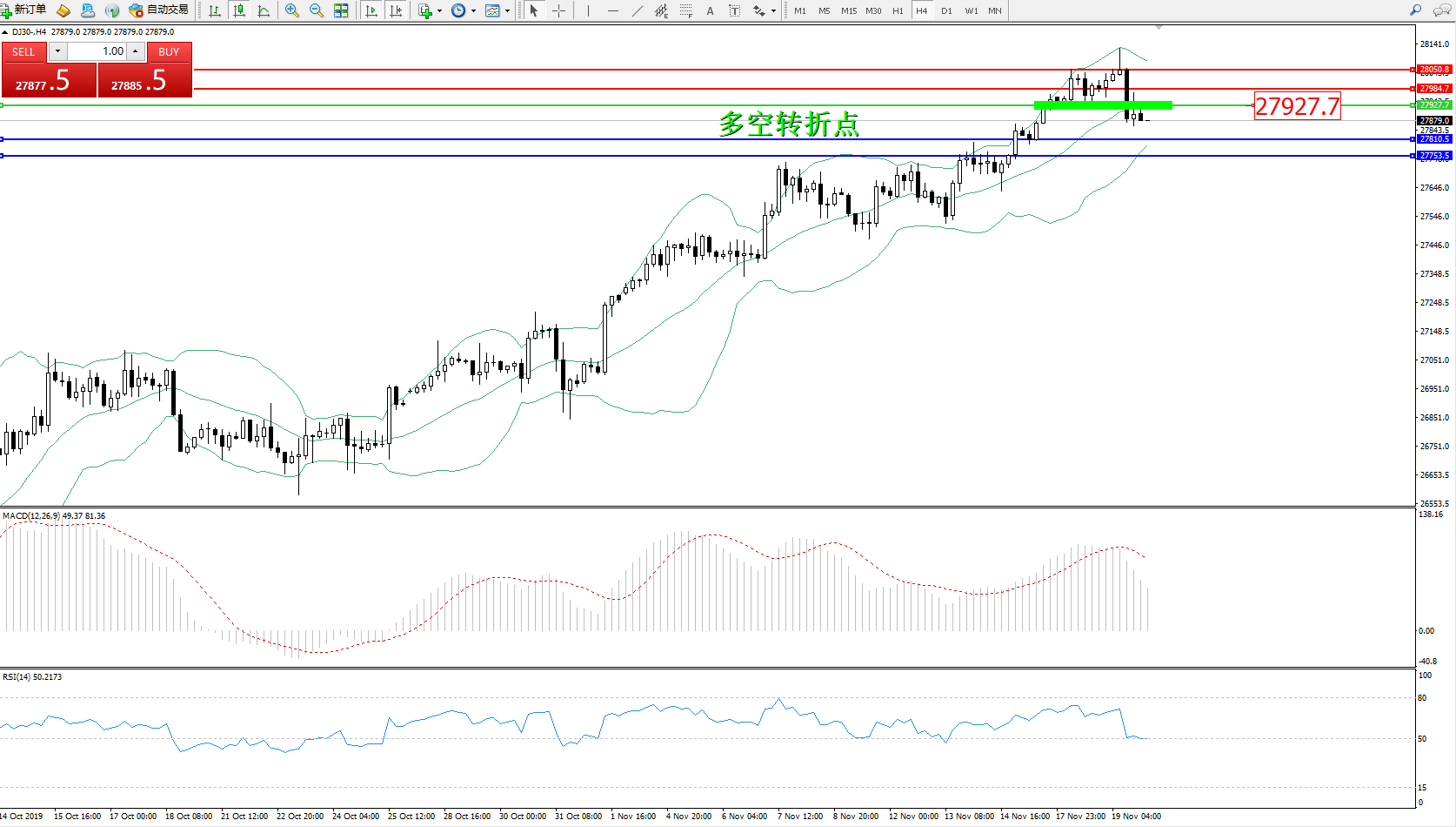 道琼斯指数DJ30—— 4小时K线图显示: