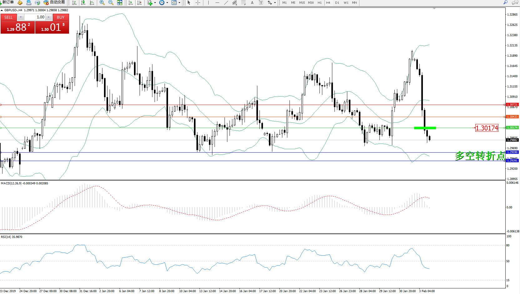 交易策略:1.30174下方看跌,目标1.29590、1.29391