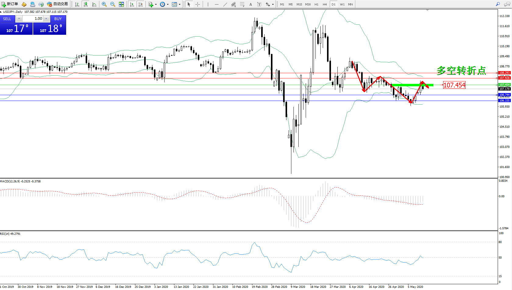 交易策略:107.454下方看跌,目标106.744106.335