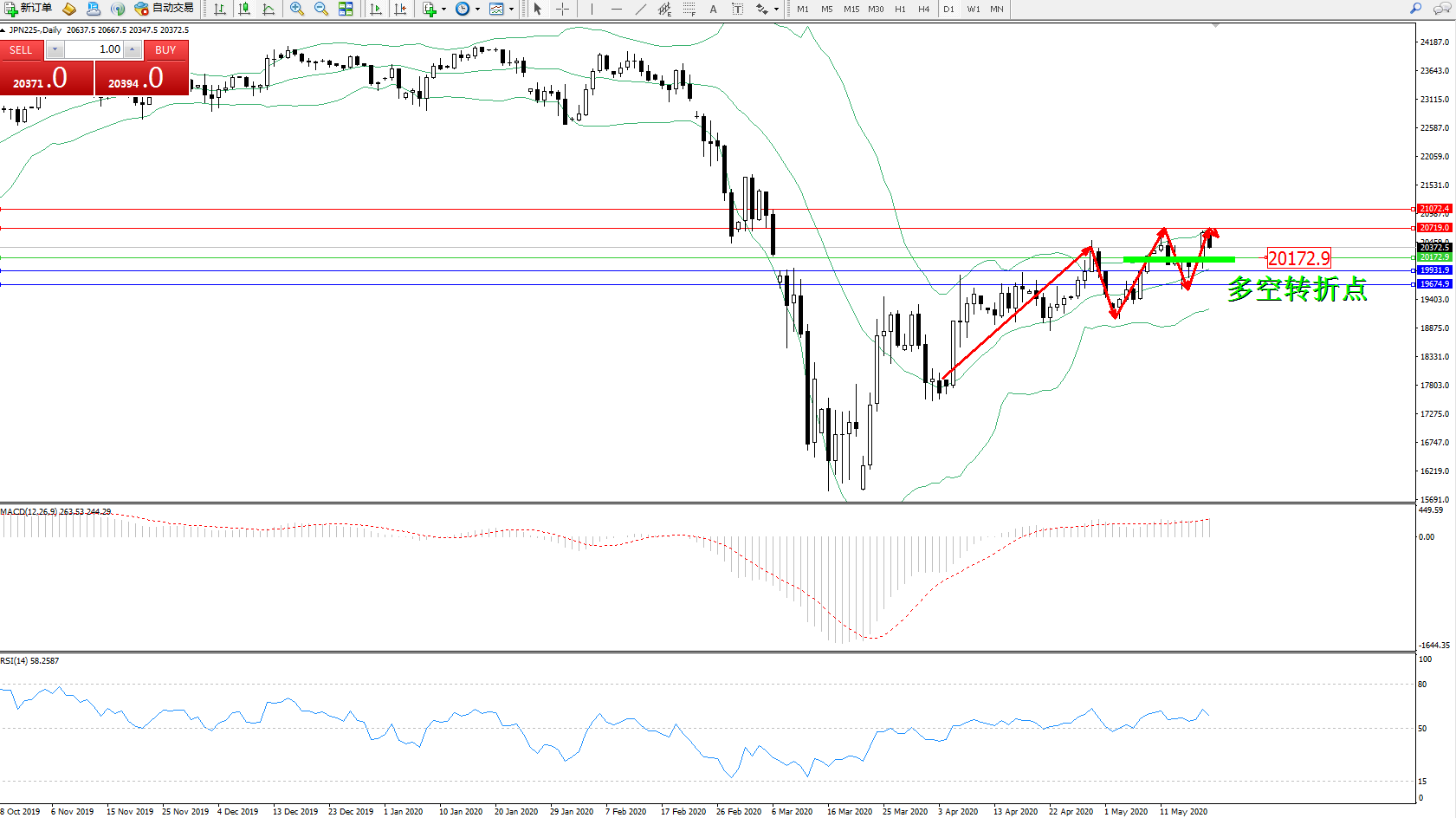 日经225指数519日(周二)收盘上涨330.77点,涨幅1.64%,报20464.50点。日本时事通信社报道称,日本自民党(执政党)的一个工作组提出10万亿日元的融资计划,帮助那些被视为对国家安全至关重要的公司保持竞争力;融资工具将包括次级贷款和优先股;正式决定将于周二做出,并将纳入自民党政策负责人岸田文雄的政府建议之中;日本政府计划在本月的第二次补充预算中反映这些提议。风险意愿增强令美元承压,因美联储主席鲍威尔表示愿意印更多美元,延长货币刺激措施,以对抗冠状病毒经济危机,令投资者感到鼓舞。