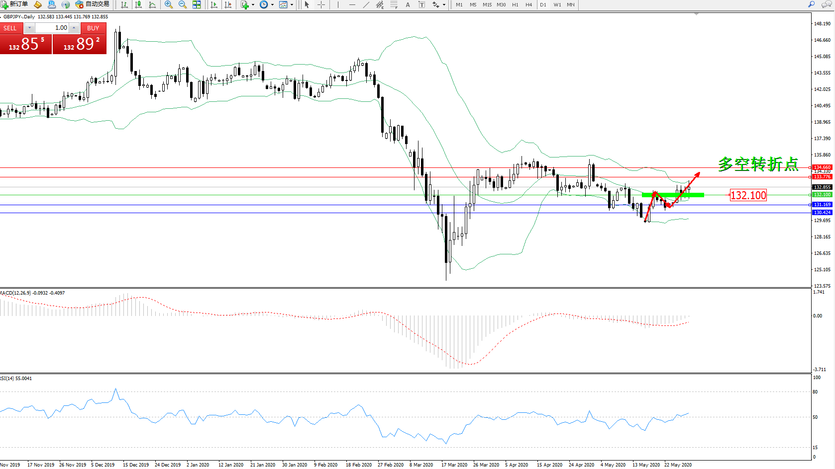 交易策略:132.100上方看涨,目标133.776134.660