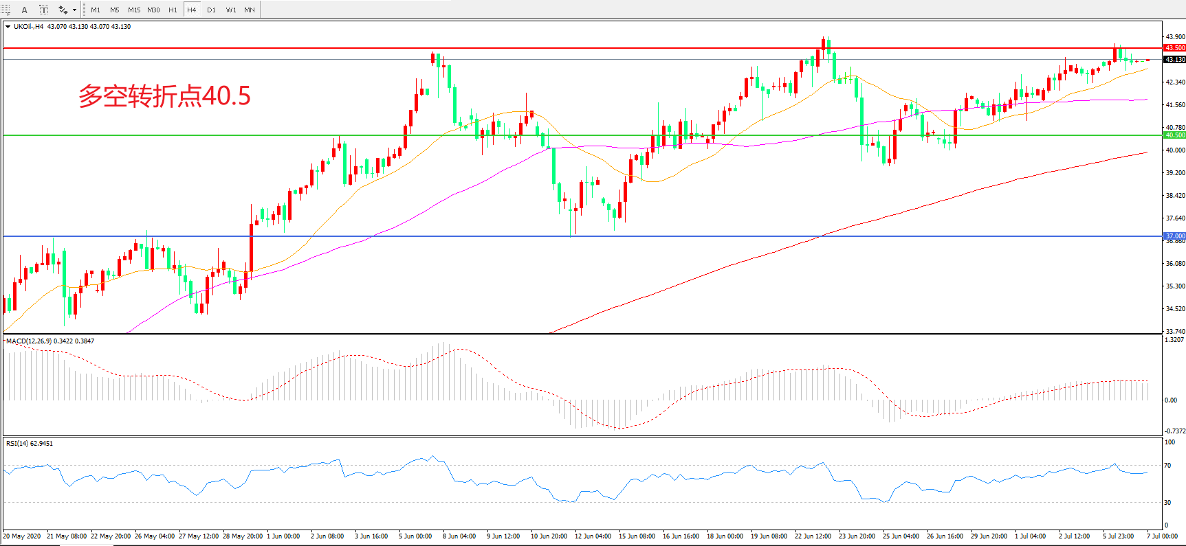 周一(7月6日),多空双拉锯持续,布伦特原油延续高位震荡,收报43.12美元/桶。从日内的反应上来看,到压力位附近之后油市成交量并没有大幅增加,增加的成交量仅仅是多头发力上行,市场容量变浅会让波动性和无序性加大,但也更有利于多头或空头选择方向。