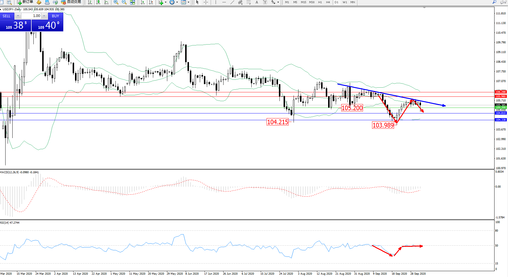 备选策略:105.200下方看跌,目标104.810、104.338