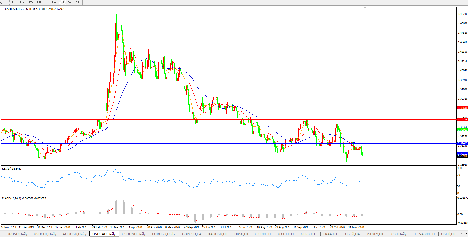 美元兑加元在周二延续跌势,欧洲时段最低跌触两周低点1.3011,关键的1.30心理关口再度面临挑战。一方面,美国政局与财政协议前景仍充满变数,令美元隔夜的反弹只是昙花一见,另一方面,国际油价在需求看好而供给存在风险的大背景下走高至三个月高点,也对与油价关联密切的货币加元有拉动作用; 后市美元兑加元进一步的支撑水平下看前期低点1.2994,之后是1.2952,而11月9日辉瑞疫苗发布后的反应低点则是当前自9月份以来这轮盘整行情的终级支撑,一旦跌破将跌向2018年10月的低位1.2783。反过来,油价若在后市意外录得大幅回落,美元兑加元收复1.3143这一30日均线切入位后,有望实现汇价的暂时性企稳