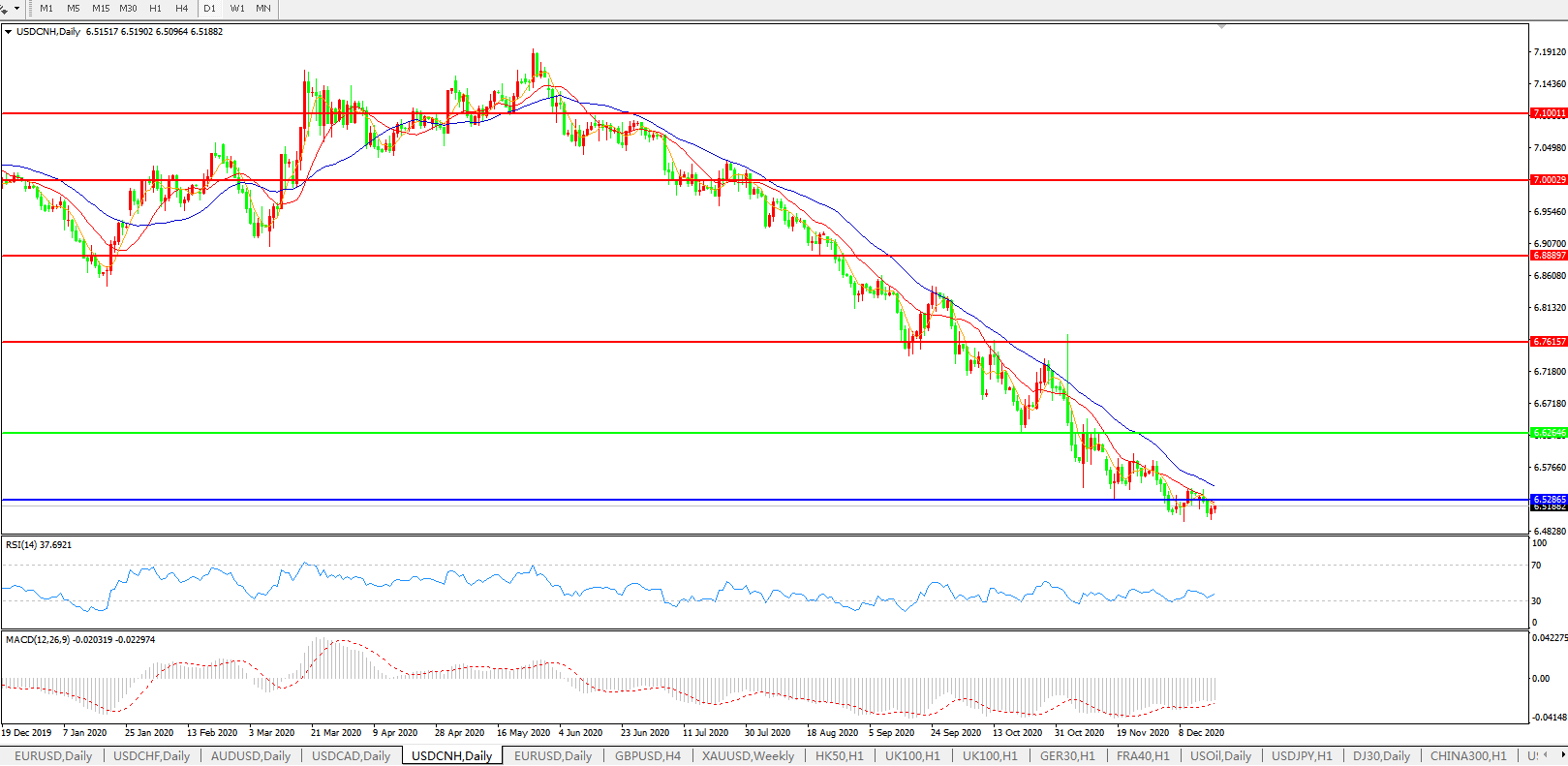 美元兑人民币USDCNH 日线图: