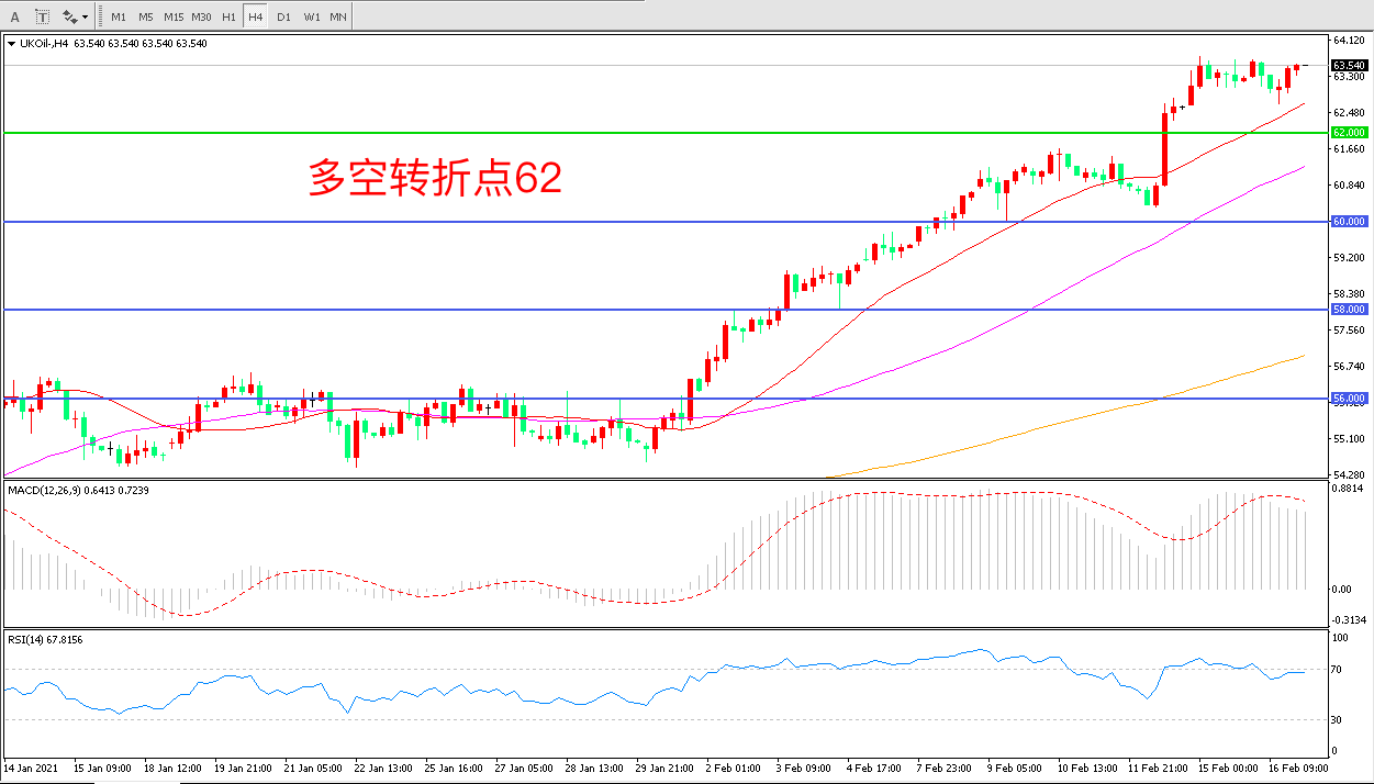 周二(2月16日),历史性的冬季风暴袭击美国,北美最大的炼油厂被迫关闭,市场担忧得州的极端寒冷天气可能导致油井停产和物流问题,或致供应中断,布伦特原油再度上扬,收报63.54美元/桶。由于市场对美国经济刺激计划将对提振经济及能源需求怀有很大信心,风险情绪氛围良好,刺激原油价格不断走高