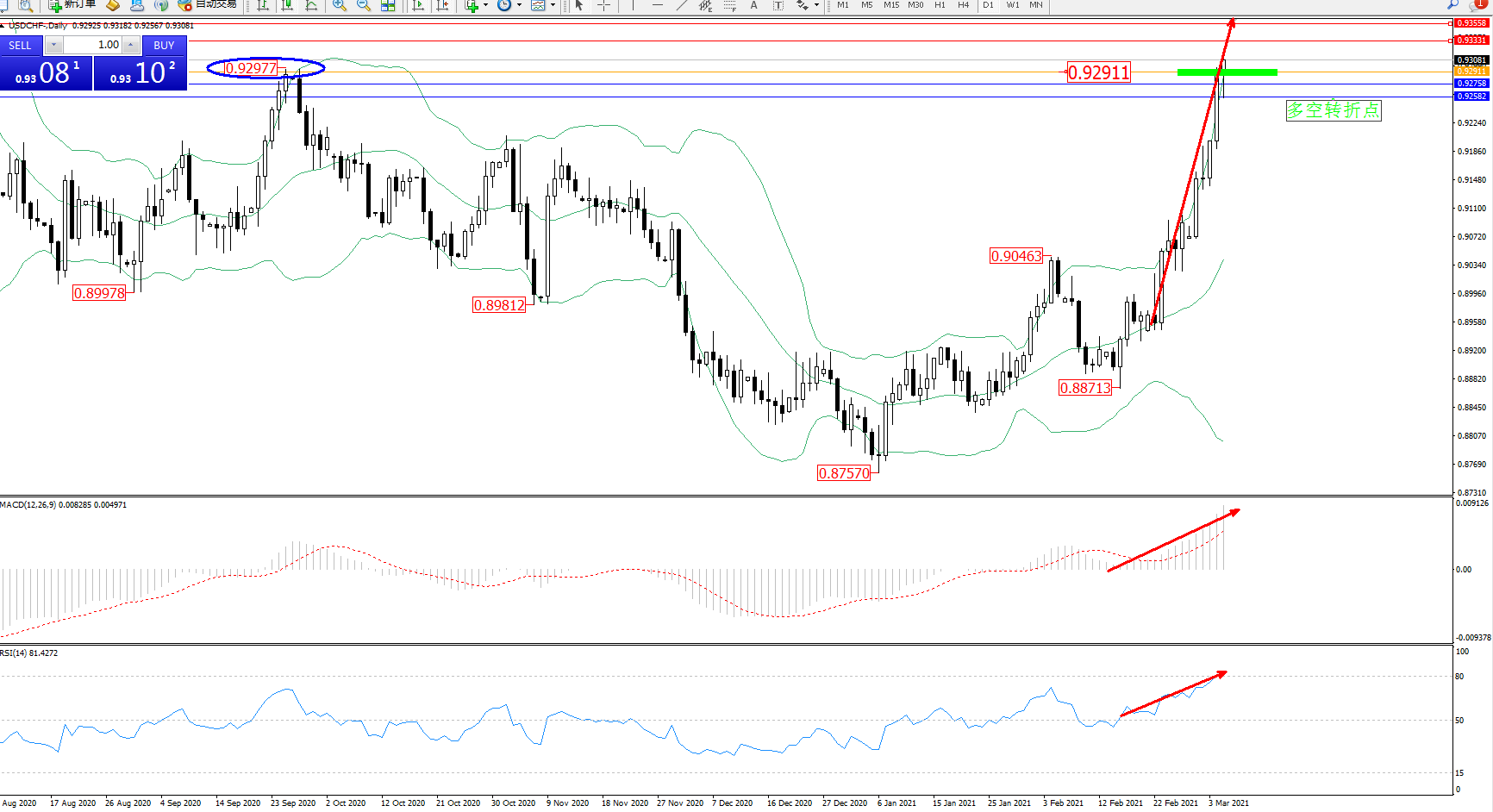 技术点评:多头动力延续布林带指标上轨附近节点持续震荡上扬,且未见止步迹象,布林带指标呈张口走势持续中,前期高位0.92977位置节点已然破位,有继续向上移动态势,MACD指标处于多头区域维持震荡持续向上移动中,RSI指标处于多头区域维持震荡上移至超买区80均衡线附近节点整理;