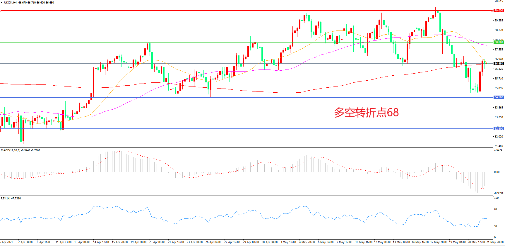 4小时图看,油价连续破位后长阳拉升,短期走势有所回暖,55周期均线成为上方阻力,66美元下方支撑,MACD绿柱缩短,RSI指标走平,日内延续震荡概率较大。