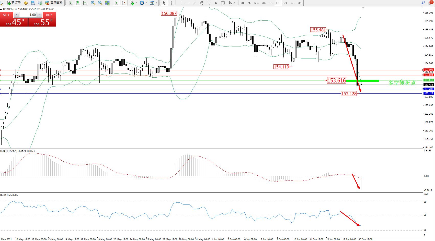 交易策略:153.616下方看跌,目标153.288、153.128