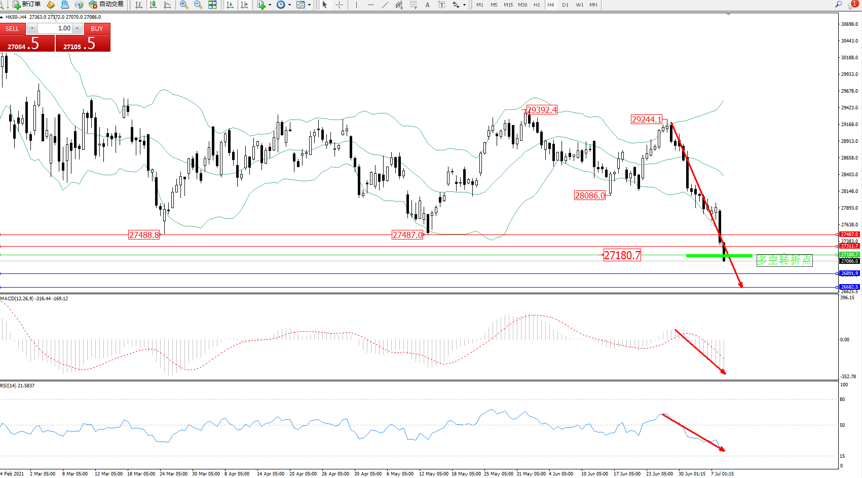 香港恒生指数7月8日(周四)收盘下跌807.49点,跌幅2.89%,报27153.13点;港股三大指数大跌,科技股领衔下挫,致恒生科技指数大跌3.71%报7321点,恒指为今年2月以来最大单日跌幅,且连续第8日下跌并创下1月以来新低。互联网监管持续加码,大型科技股再度重挫,美团大跌6.4%,百度、阿里巴巴跌超4%,腾讯、网易、京东、快手均跌超3%;今日大市成交额超2000亿港元,南下资金净流出28.13亿港元。市场监管总局再出手,昨日宣布对互联网领域(包括阿里、腾讯在内)22起违法实施经营者集中案件立案调查,并根据《中华人民共和国反垄断法》作出行政处罚决定,对涉案企业分别处以50万元人民币罚款。另外,央行副行长范一飞最新表示,对蚂蚁集团采取的措施会推行到其他支付服务市场主体。