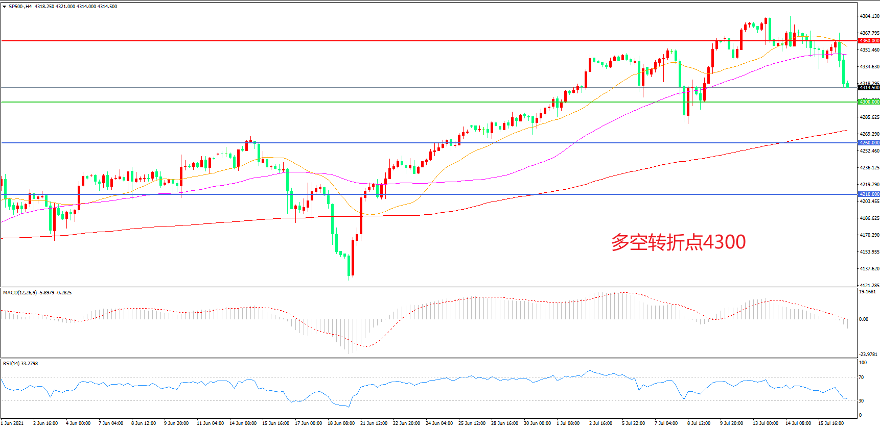 4小时图看,标普500长阴下破,短期升势暂缓,短期均线拐头向下,4300成为下方支撑,MACD绿柱增加,RSI指标向下,日内延续震荡概率较大。