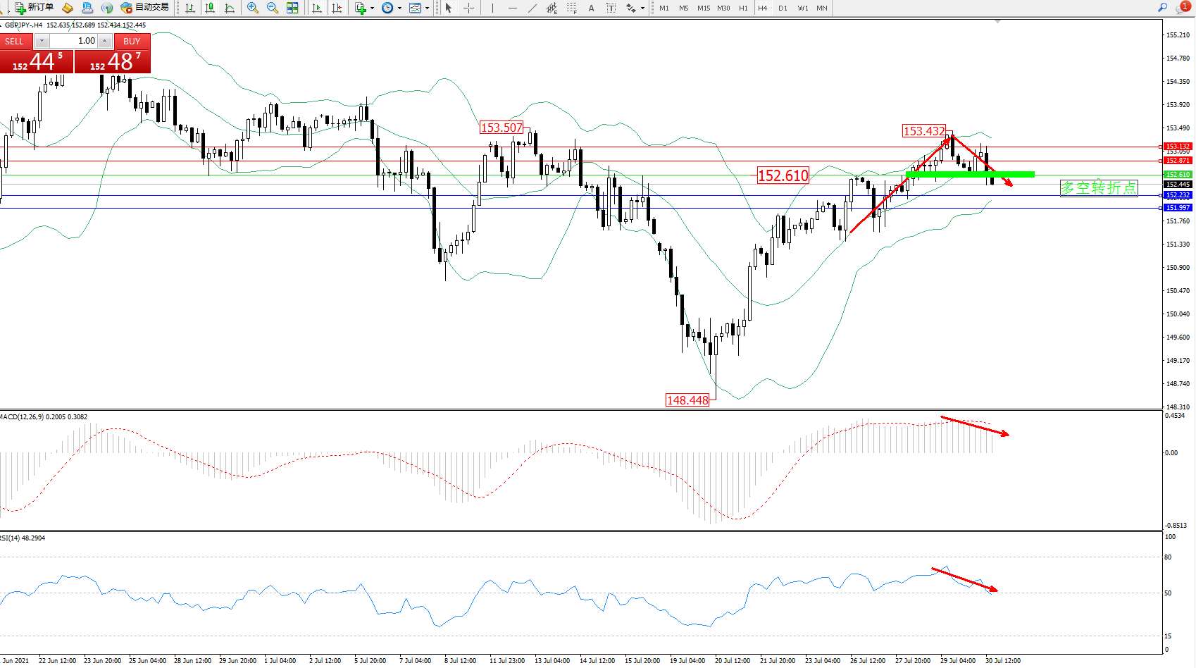 技术点评:多头动力延续布林带指标通道中上轨区间持续震荡上扬,高位抵达153.432位置短暂遇阻回撤,多头动力减弱, 空头动力开始伺机入场,布林带指标呈收口走势中,MACD指标处于多头区域高位整理徘徊向下移动,RSI指标处于多头区域持续震荡回升至50均衡线附近整理;