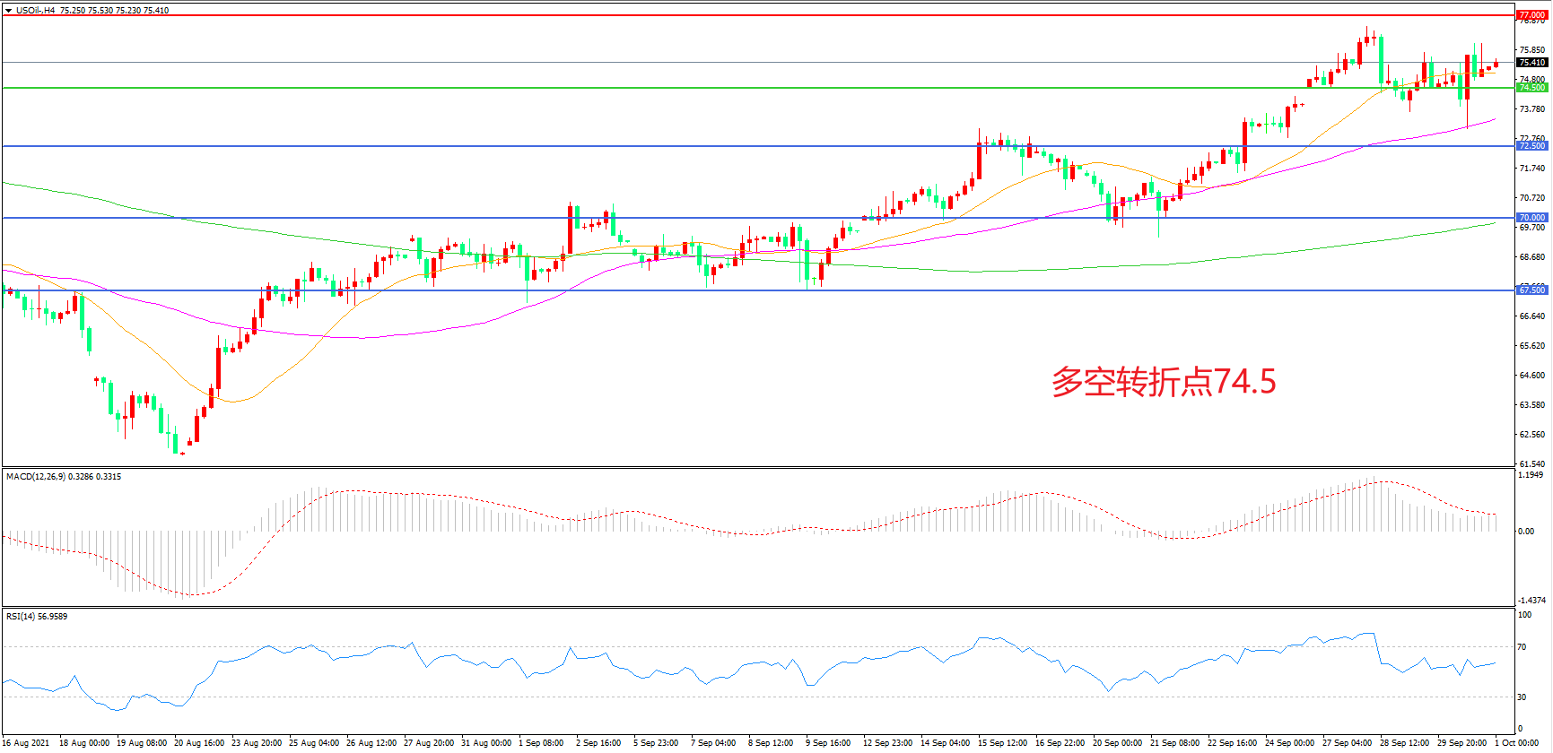 周四(9月30日),能源短缺的现状依然支撑着市场多头,美国WTI原油延续强势表现,收报75.35美元/桶。近期有报道声称中国准备购买更多石油和其他能源供应,以满足其不断增长的需求,而市场供应方面OPEC表示可能会考虑除将日产量提高40万桶的现有协议外的其他选项,以应对油价接近三年高点以及消费国要求增加供应的压力,短线油价延续震荡上行概率较大。