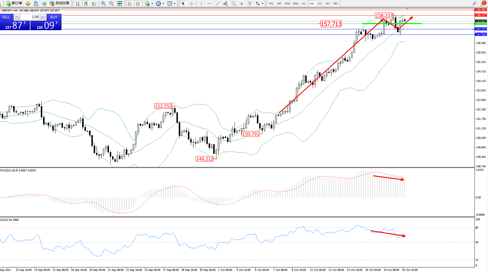 交易策略:157.713上方看涨,目标158.237、158.580