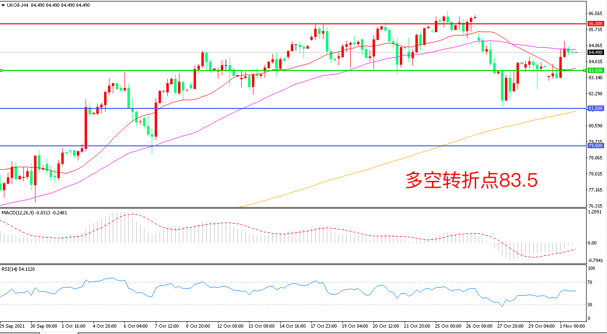 4小时图看,油价低位调整后再度拉升,整体表现偏强,83.5成为多空分水岭,86成为上方阻力,MACD绿柱缩短,RSI指标走平,日内延续震荡概率较大。