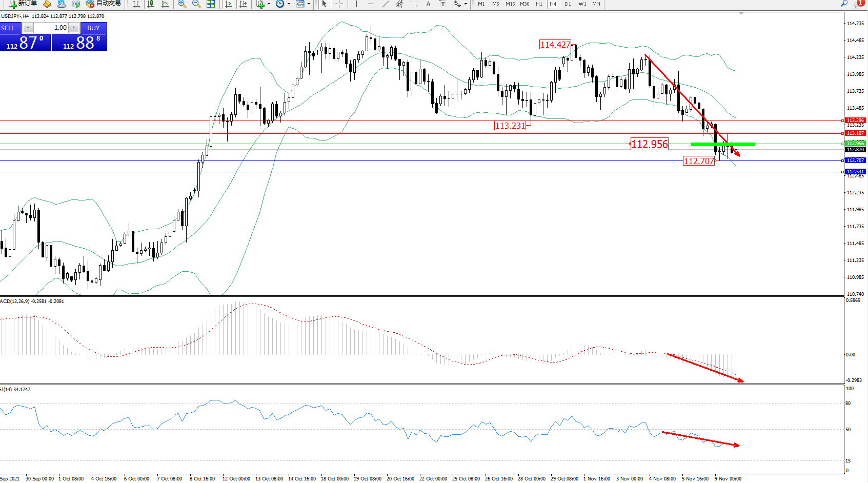 交易策略:112.956下方看跌,目标112.707、112.541