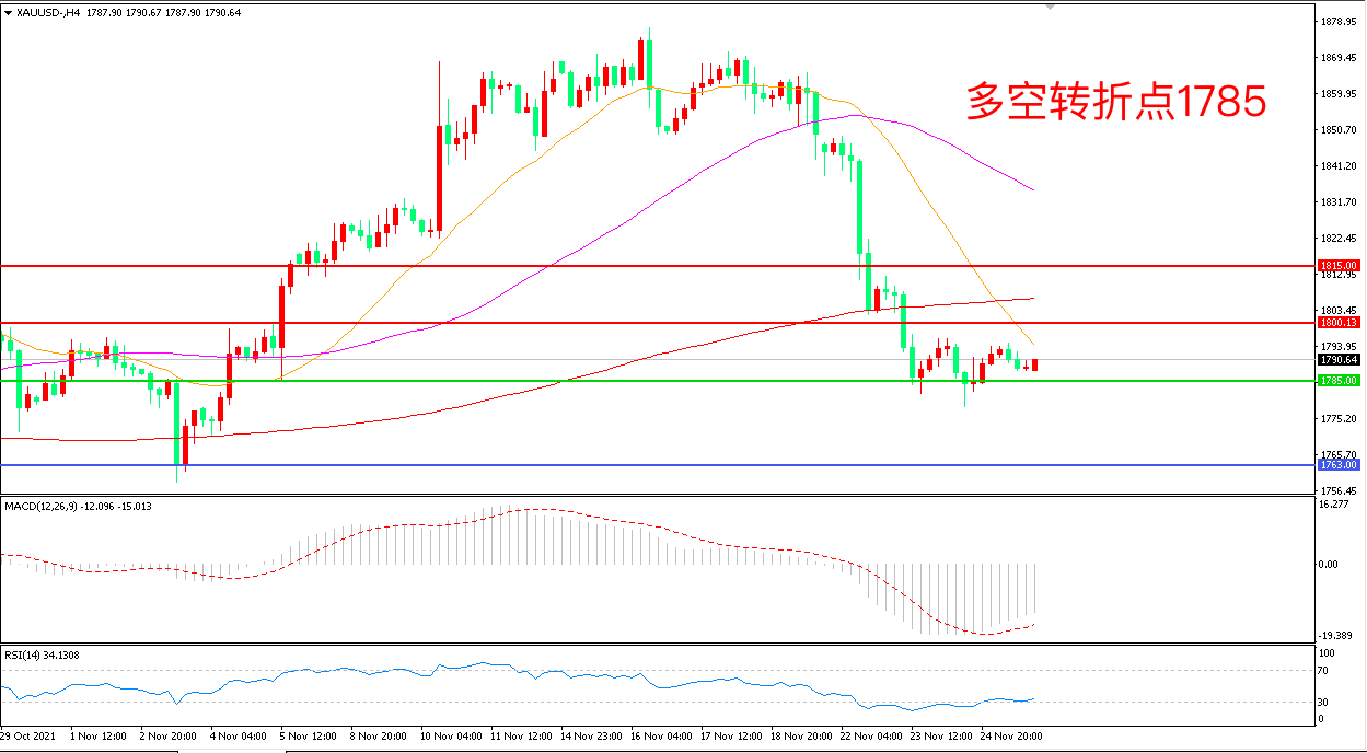 周四(11月25日),美国感恩节假期,市场交投清淡,现货黄金在暴跌后获得喘息时机,收报1788.63美元/盎司。近期公布的美联储会议纪要显示,美联储高层异常鹰派的姿态,而美国经济数据持续强劲和通胀不断高企将会促使决策者加快加息步伐,金价中期仍然面临较大压力。