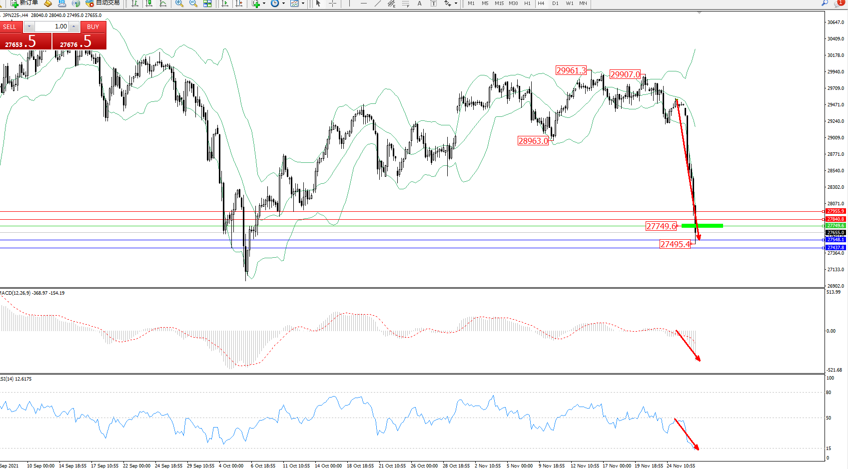 日经指数JPN225——4小时K线图显示: