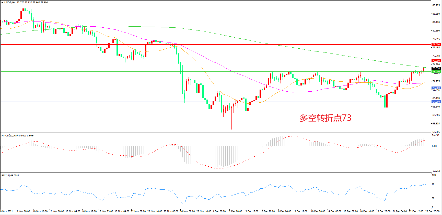 4小时图看,油价于73美元附近企稳后,短期表现偏强,200周期均线突破在即,21周期均线向上形成金叉,MACD红柱增加,RSI指标走平,日内震荡上行概率较大。