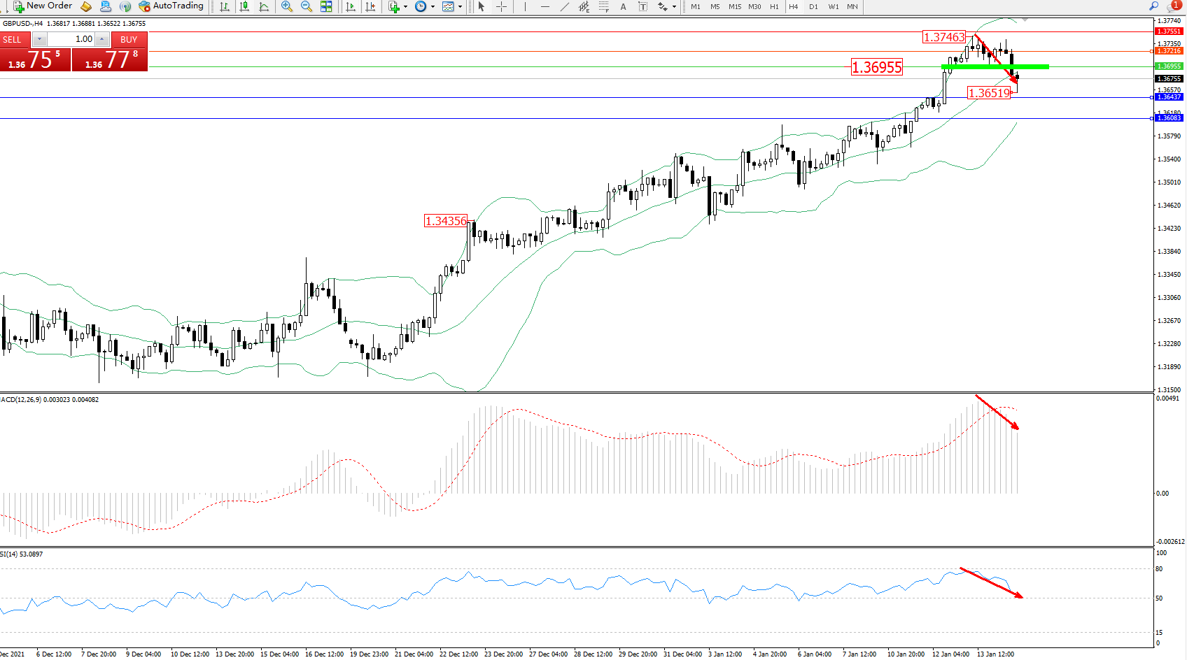交易策略:1.36955下方看跌,目标1.36437、1.36083