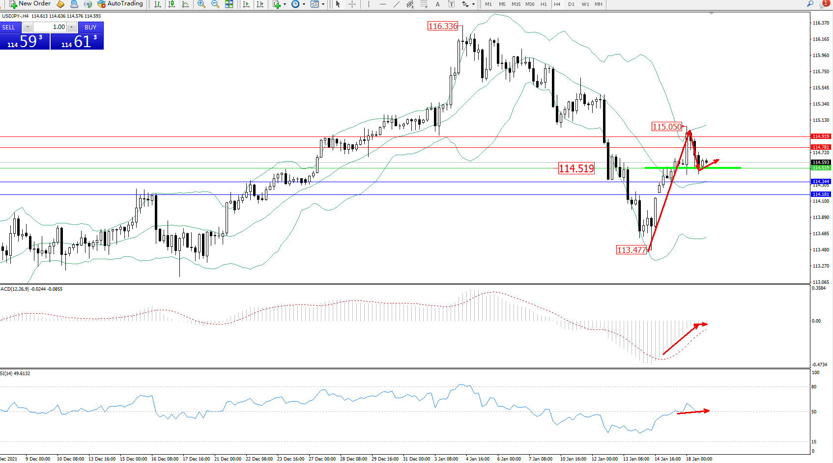 技术点评:低位多头动力强势拉升上扬,触及布林带指标上轨至115.050位置节点后震荡回撤,短期纠结于布林带指标通道中上轨区间震荡,多头动力依旧有继续上扬态势,布林带指标呈收口走势后开始平移,且有缓慢张口迹象,MACD指标处于空头区域低位强势震荡上扬后,即将触及0轴线附近节点,RSI指标纠结于50均衡线附近窄幅整理中;