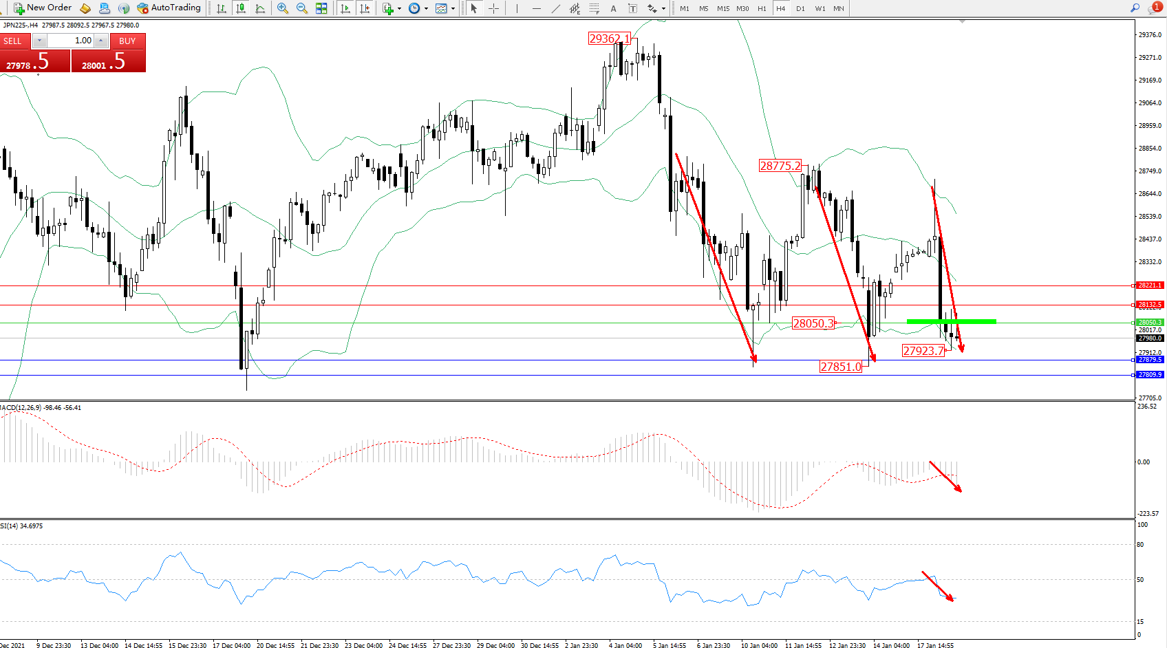 交易策略:28050下方看跌,目标27879、27809