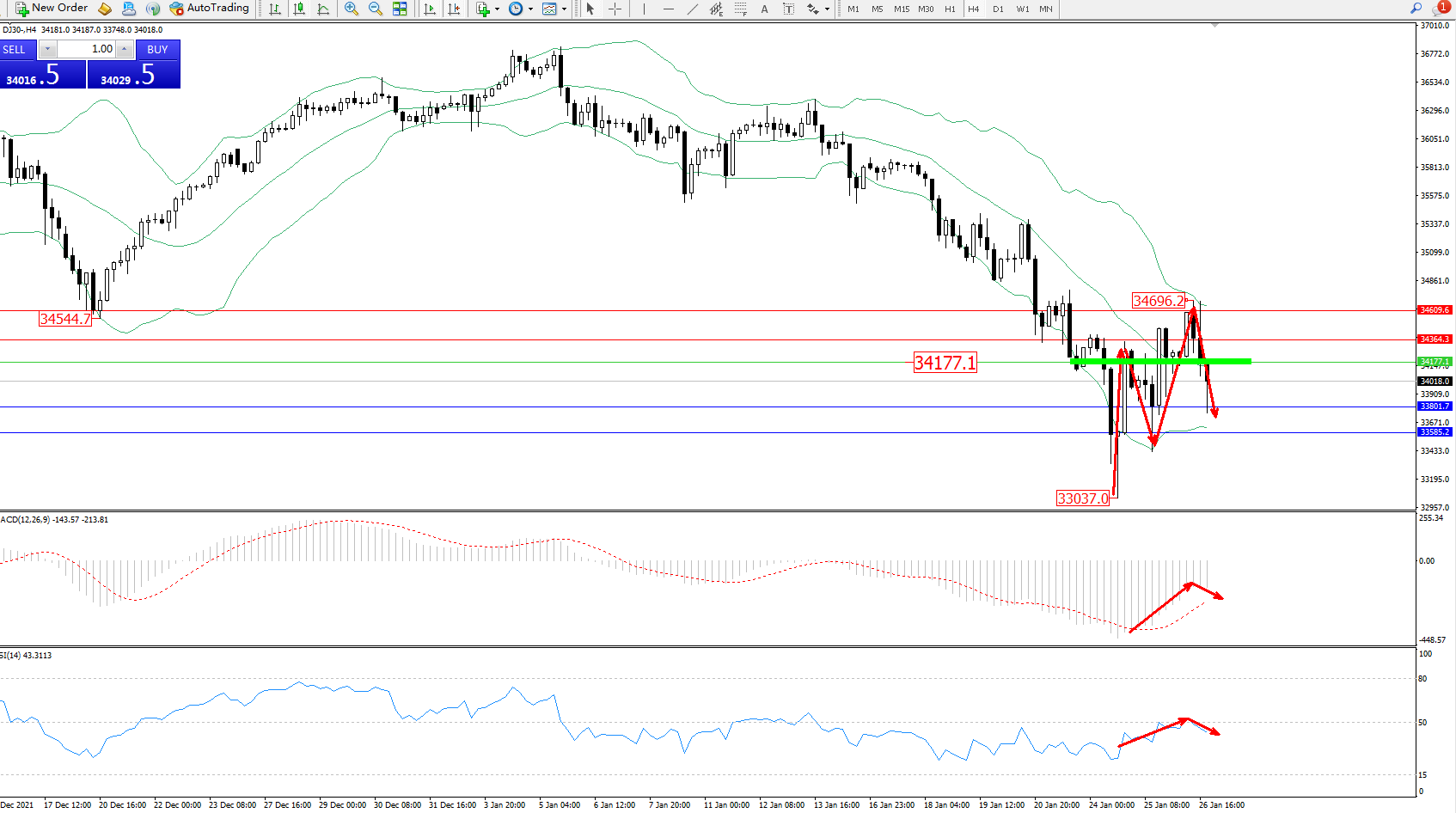 道琼斯指数DJ30——4小时K线图显示: