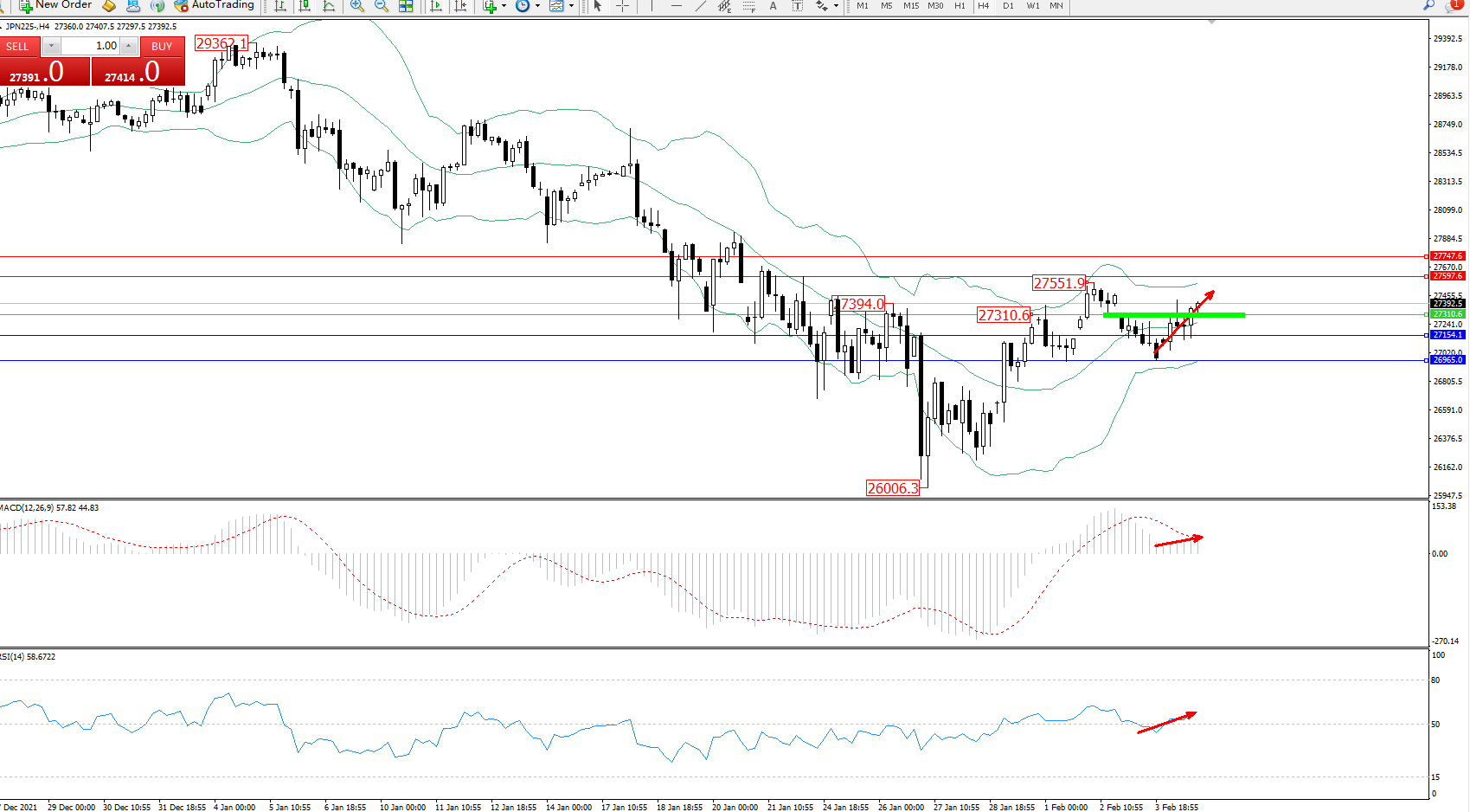 日经225指数2月4日(周五)收盘上涨180.19点,涨幅0.66%,报27421.50点。日本央行行长黑田东彦:即使剔除一次性因素,日本的消费通胀仍弱于美国和欧洲。即使排除暂时因素,日本的通货膨胀率也很低。工资、物价必须同时上涨才能达到2%的通胀率。日本价格增长疲软背后的最大因素是,家庭和企业是在价格不会大幅上涨的情况下采取行动。保持强有力的货币宽松政策,以支持经济,帮助工资和价格增长很重要。