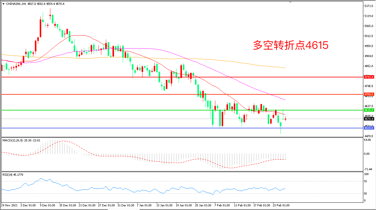 4小时图看,沪深300高开低走,窄幅震荡迹象明显,4615成为上方阻力,4520成为下方支撑, MACD绿柱增加,RSI指标走平,日内延续震荡概率较大。