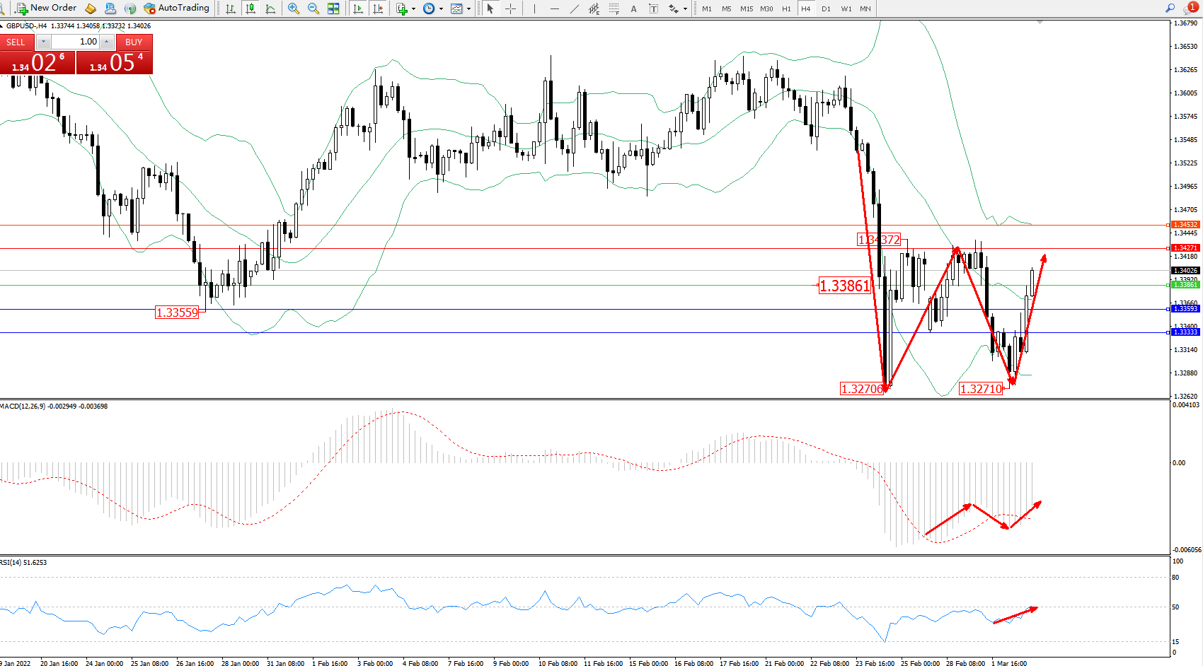 交易策略:1.33861上方看涨,目标1.34271、1.34532