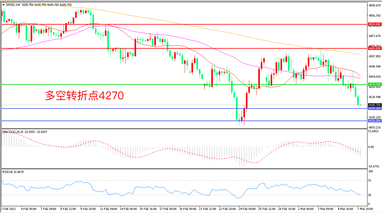周一(3月7日),投资者考虑加大对俄能源制裁令市场越发担心俄乌危机恐引发经济滞胀,美股表现较为疲软,标普500延续低迷走势,收报4185.75点。本周,投资者正准备迎接又一份爆表的美国通胀报告,而持续剑拔弩张的俄乌局势则日益给美股和全球经济蒙上阴影,滞胀临近的情况下,美股延续宽幅震荡概率较大。