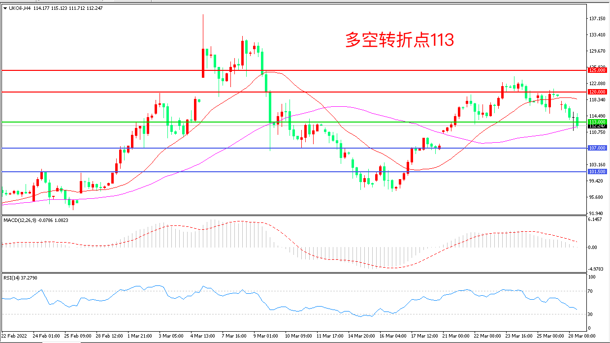 周一(3月29日),《金融时报》报道称,据了解,俄罗斯不再要求乌克兰“去纳粹化”,如果乌克兰在军事上保持不结盟,准备允许乌克兰加入欧盟,俄乌停火的曙光导致投资者抛售原油,布伦特原油大幅下挫,收报112.24美元/桶。本周,OPEC+将再度召开部长级会议讨论增产计划,油价近期波幅将会明显放大。