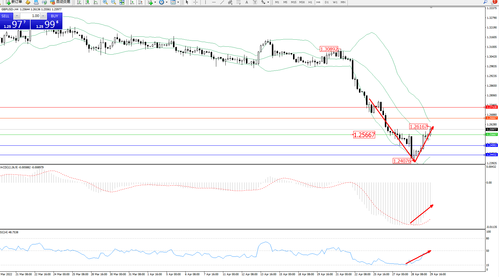 交易策略:1.25667上方看涨,目标1.26667、1.27328