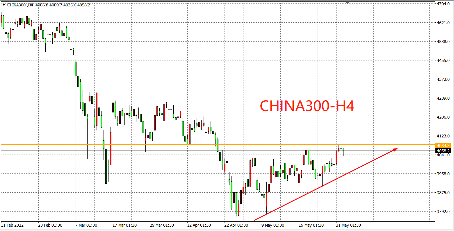 4小时图看,沪深300低点出现上抬,有较明显的底部上攻形态,日内有望延续震荡上涨。