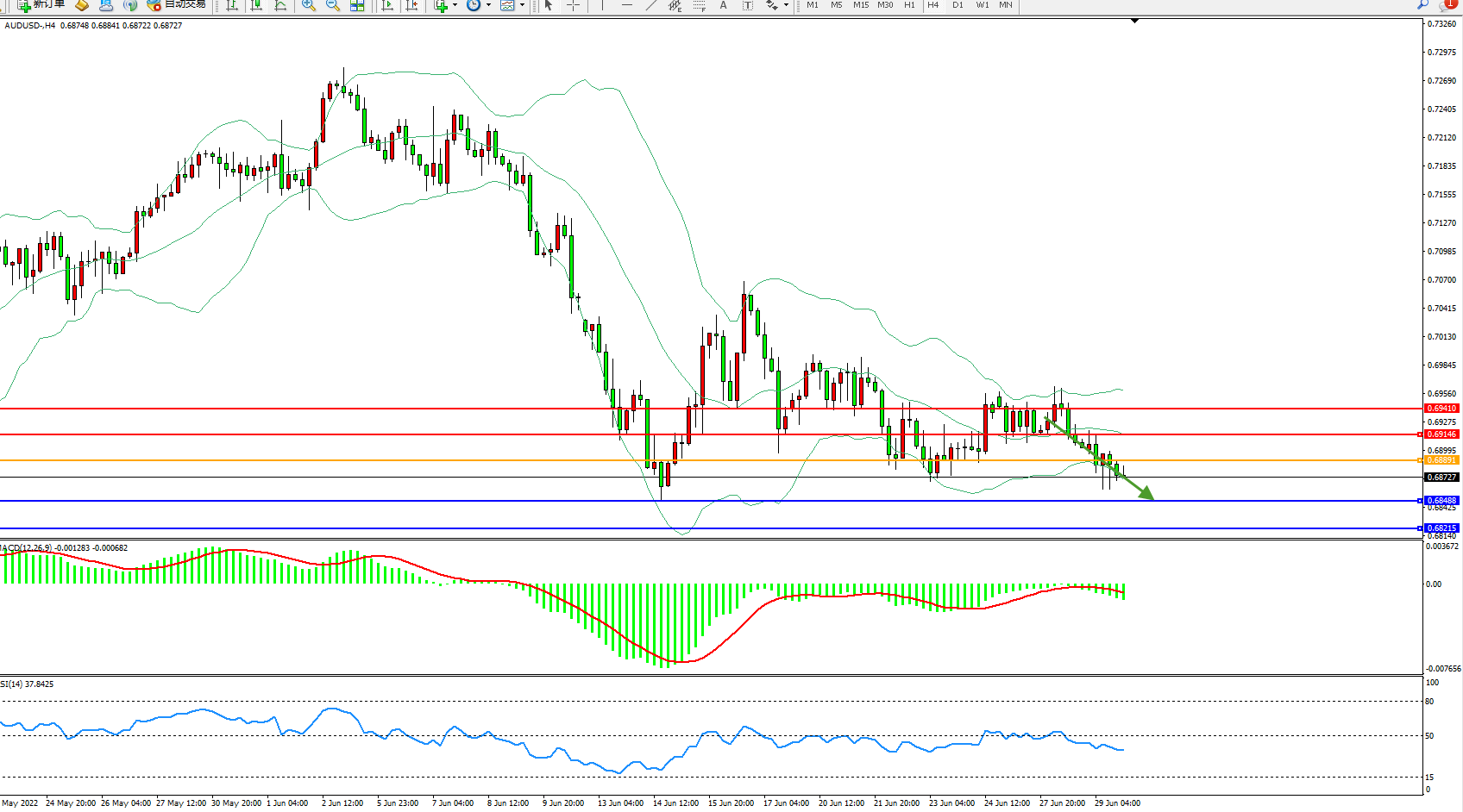 交易策略:0.68891下方看跌,目标0.68488、0.68215