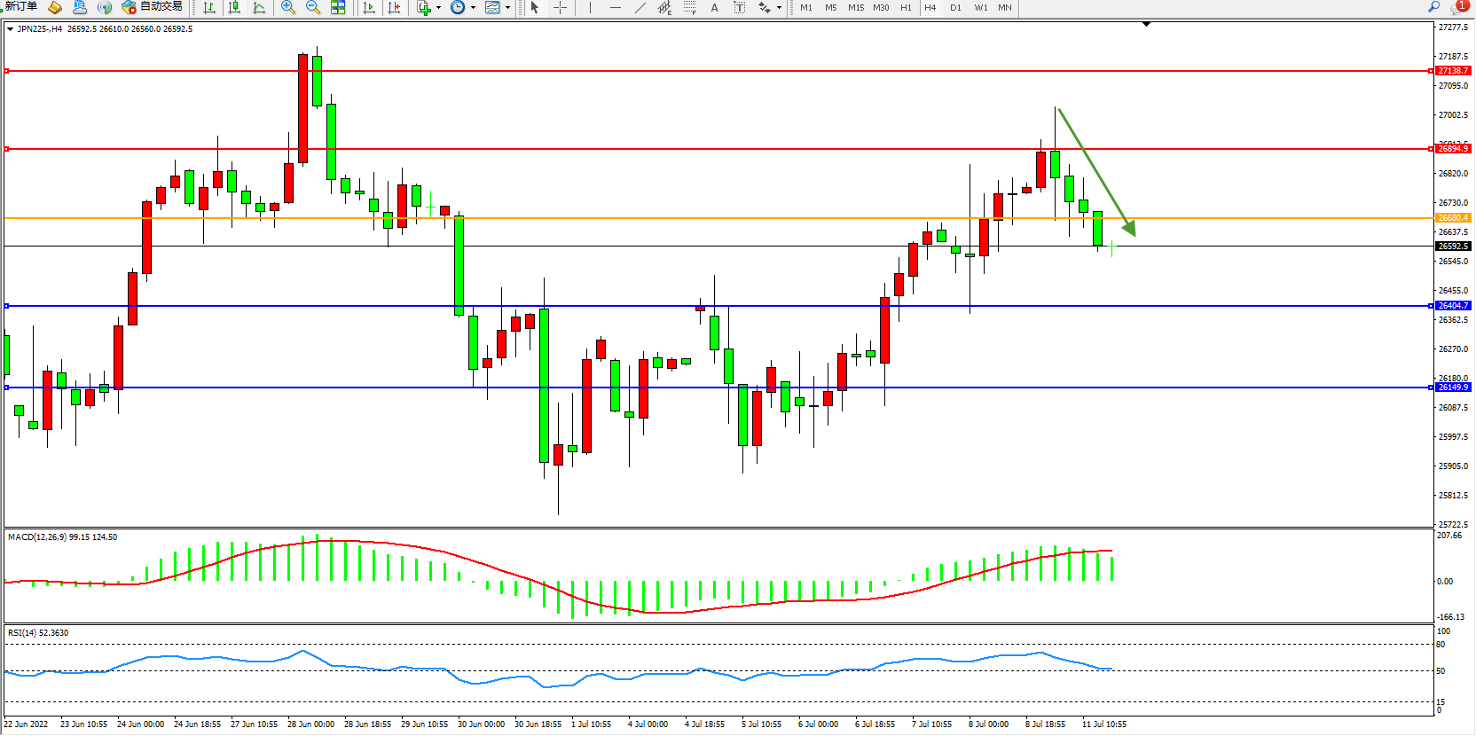 日经指数JPN225——4小时K线图显示: