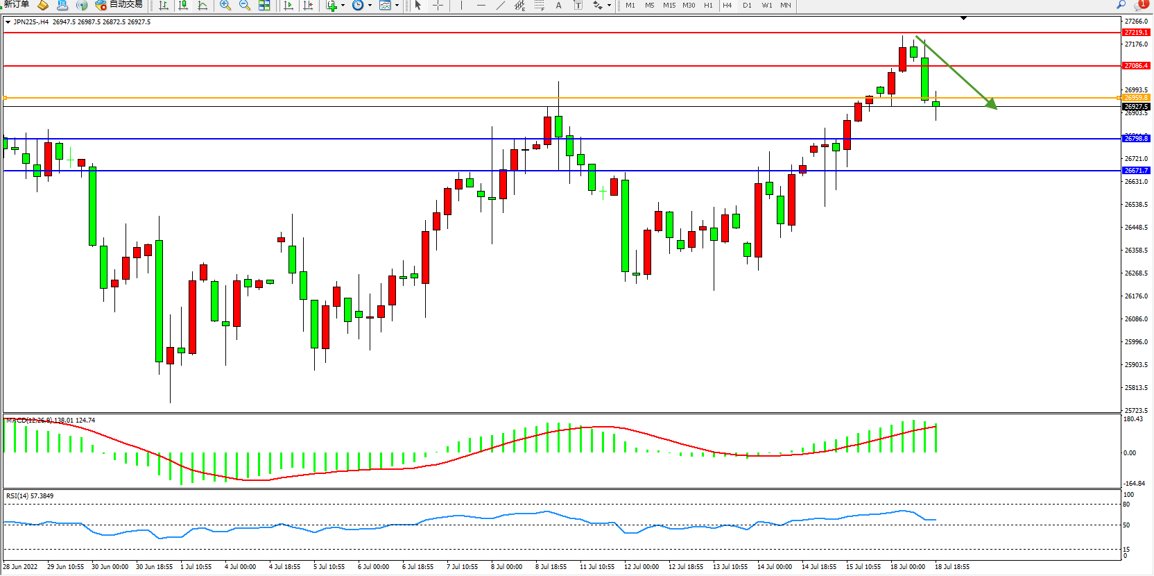 日经指数JPN225——4小时K线图显示: