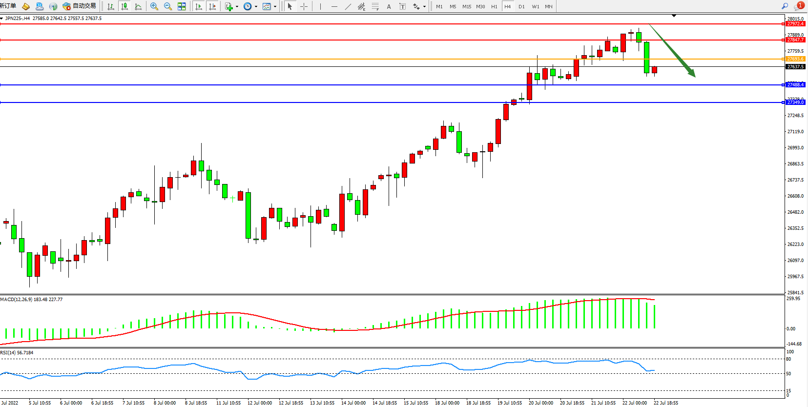 日经指数JPN225——4小时K线图显示: