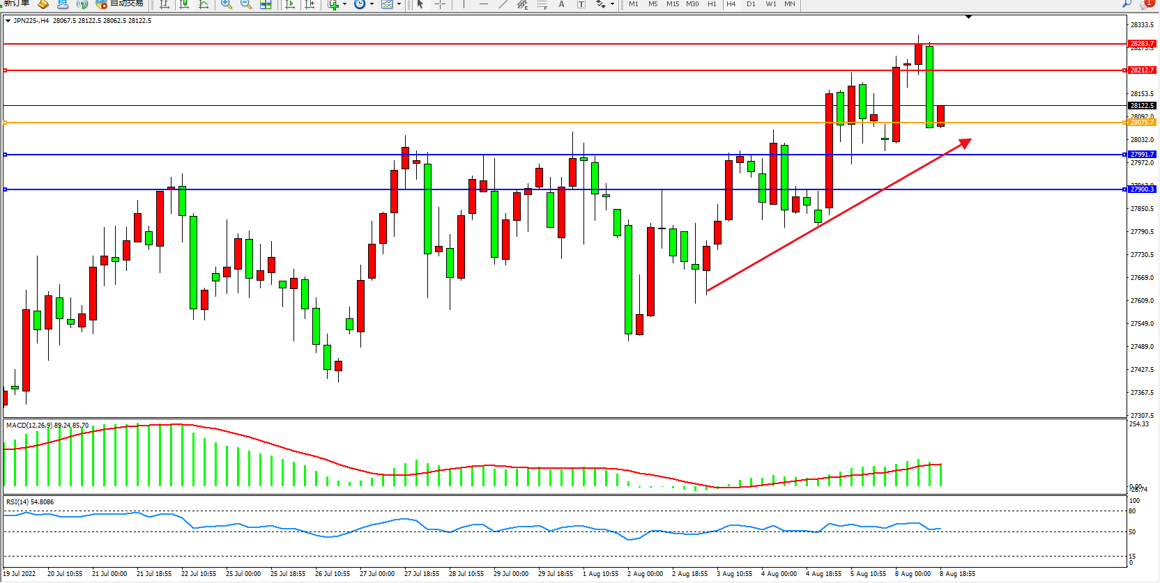 日经指数JPN225——4小时K线图显示: