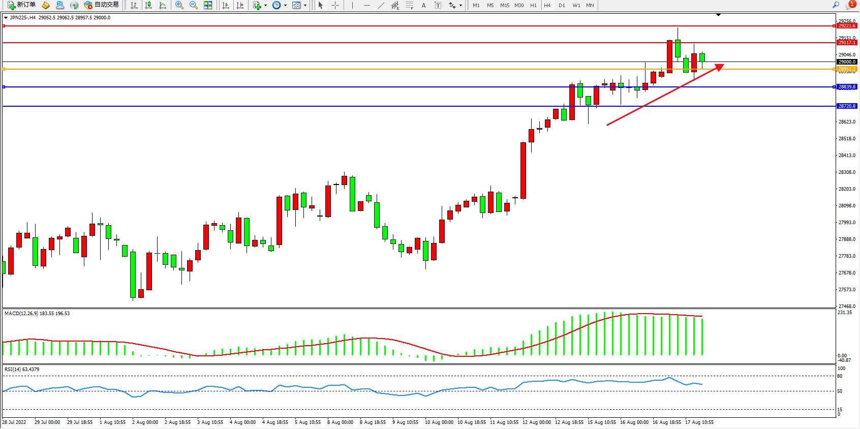 日经指数JPN225——4小时K线图显示:
