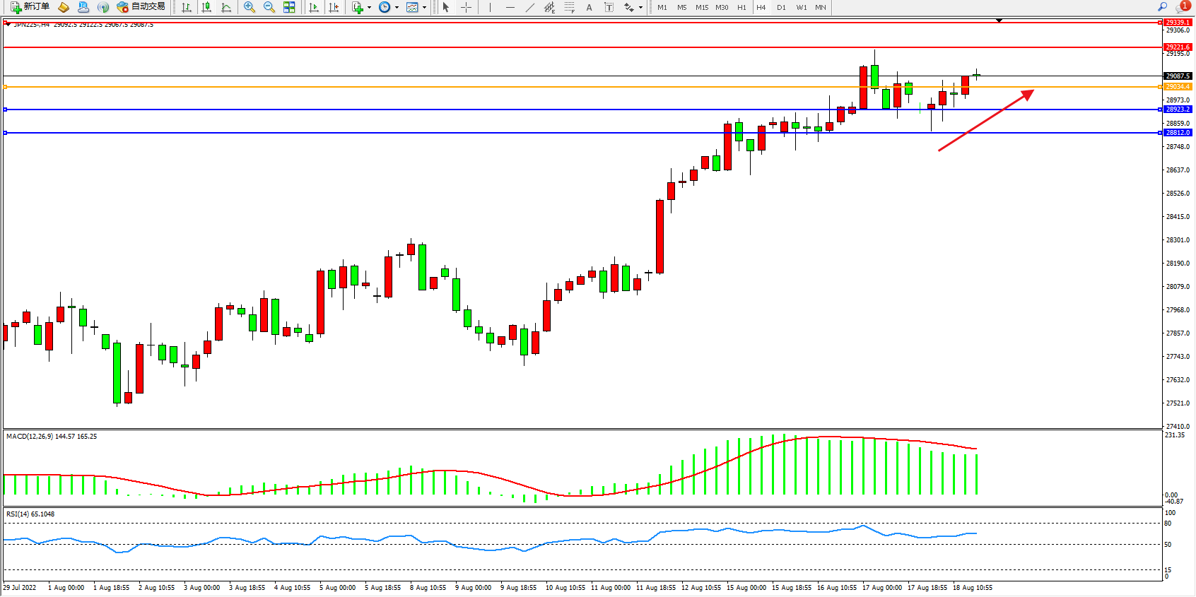 日经指数JPN225——4小时K线图显示:
