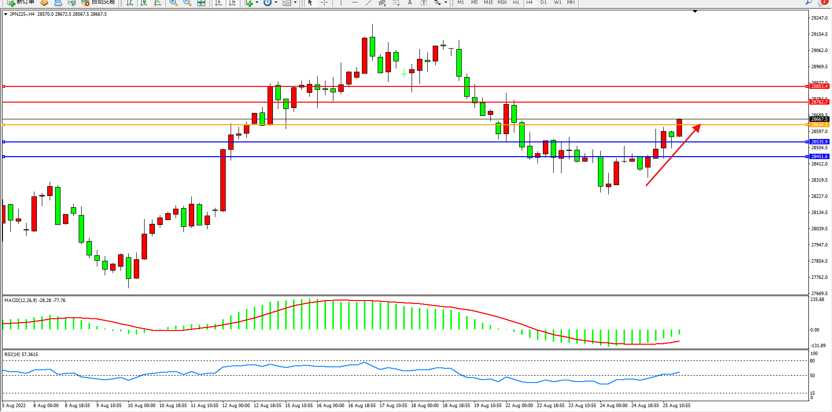 日经指数JPN225——4小时K线图显示: